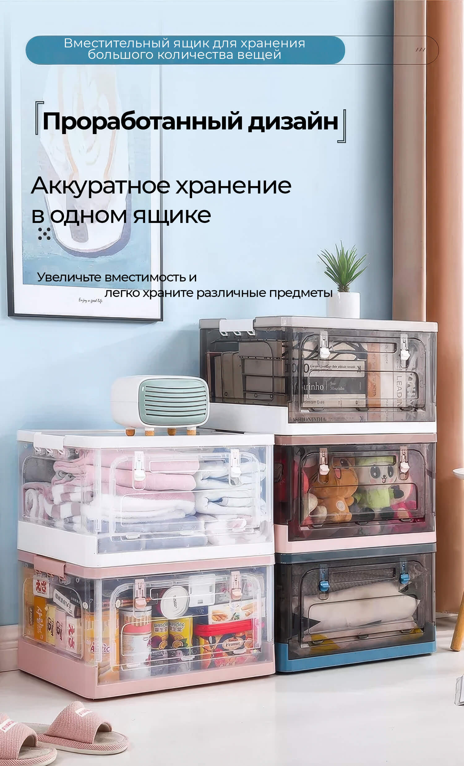 Пластиковая коробка с крышкой надежно защищает вещи от пыли и влаги, сохраняя их в чистоте. Прочная конструкция выдерживает нагрузку, а колесики обеспечивают легкость передвижения. Благодаря складной конструкции ящик удобно хранить, когда он не используется.